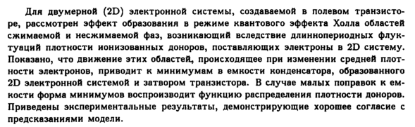 Для двумерной (2D) электронной системы, создаваемой в полевом транзисторе, рассмотрен эффект образования в режиме квантового эффекта Холла областей сжимаемой и несжимаемой фаз, возникающий вследствие длиннопериодных флук-туаций плотности ионизованных доноров, поставляющих электроны в 2D систему. Показано, что движение этих областей, происходящее при изменении средней плотности электронов, приводит к минимумам в емкости конденсатора, образованного 2D электронной системой и затвором транзистора. В случае малых поправок к емкости форма минимумов воспроизводит функцию распределения плотности доноров. Приведены экспериментальные результаты, демонстрирующие хорошее согласие с предсказаниями модели.