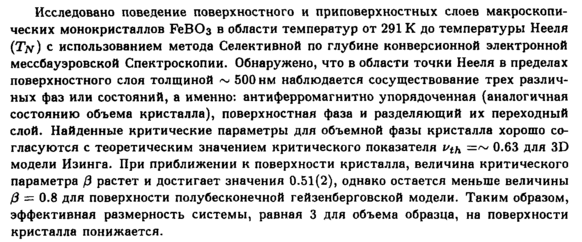 Исследовано поведение поверхностного и приповерхностных слоев макроскопических монокристаллов FeBC»3 в области температур от 291К до температуры Нееля (Тдг) с использованием метода Селективной по глубине конверсионной электронной мессбауэровской Спектроскопии. Обнаружено, что в области точки Нееля в пределах поверхностного слоя толщиной ~ 500 нм наблюдается сосуществование трех различных фаз или состояний, а именно: антиферромагнитно упорядоченная (аналогичная состоянию объема кристалла), поверхностная фаза и разделяющий их переходный слой. Найденные критические параметры для объемной фазы кристалла хорошо согласуются с теоретическим значением критического показателя fth =~ 0.63 для 3D модели Изинга. При приближении к поверхности кристалла, величина критического параметра β растет и достигает значения 0.51(2), однако остается меньше величины β = 0.8 для поверхности полубесконечной гейзенберговской модели. Таким образом, эффективная размерность системы, равная 3 для объема образца, на поверхности кристалла понижается.