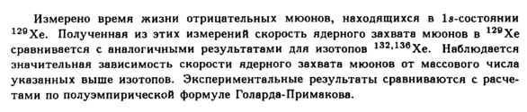 Измерено время жизни отрицательных мюонов, находящихся в ls-состоянии 129Хе. Полученная из этих измерений скорость ядерного захвата мюонов в 12ВХе сравнивается с аналогичными результатами для изотопов 132,139Хе. Наблюдается значительная зависимость скорости ядерного захвата мюонов от массового числа указанных выше изотопов. Экспериментальные результаты сравниваются с расчетами по полуэмпирической формуле Голарда-Примакова.