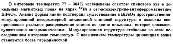 В интервале температур 77 304 К исследованы спектры спинового эха в локальных магнитных полях на ядрах 67Fe в сегнетоэлектрике-антиферромагнетике BiFeOe. Анализ формы линии подтвердил существование в BiFeOe пространственно-модулированной несоразмерной циклоидной спиновой структуры и позволил воспроизвести реальное распределение спинов по длине циклоиды, которое оказалось существенно ангармоническим. Модулированная структура стабильна во всем исследованном интервале температур. С повышением температуры циклоидная волна становится более гармонической.