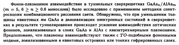 Фонон-плазмонное взаимодействие в туннельных сверхрешетках GaAsn/AlAsm (τη = 5, 6 > η > 0.6 монослоев) было исследовано с применением методики спектроскопии комбинационного рассеяния света. Обнаружено, что при уменьшении толщины квантовых ям GaAs и делокалиэации электронных состояний в сверхрешетках в результате туннелирования происходит усиление взаимодействия оптических фононов, локализованных в слоях GaAs и AlAs с квазитрехмерными плазмонами. Предположено, что плазмоны взаимодействуют также с ГО-подобными фононными модами, локализованными в квантовых островках или тонких гофрированных слоях.