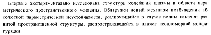 Ьпервые экспериментально исследована структура колебаний плазмы в области параметрического пространственного усиления. Обнаружен новый механизм возбуждения абсолютной параметрической неустойчивости, реализующийся в случае волны накачки развитой пространственной структуры, распространяющейся в плазме неодномерной конфигурации.