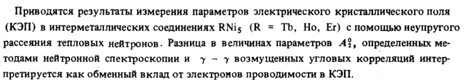 Приводятся результаты измерения параметров электрического кристаллического поля (КЭП) в интерметаллических соединениях RNi5 (R = Tb, Но, Ег) с помощью неупругого рассеяния тепловых нейтронов. Разница в величинах параметров А\% определенных методами нейтронной спектроскопии и у у возмущенных угловых корреляций интерпретируется как обменный вклад от электронов проводимости в КЭП.