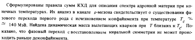 Сформулированы правила сумм КХД для описания спектра адронной материи при конечных температурах. Их анализ в канале р-мезона свидетельствует о существовании фазового перехода первого рода с исчезновением конфайнмента при температуре 7' ^~ — 140 МэВ. Найдена динамическая масса вылетающих кварков при Г близких к Τ. Показано, что фазовый переход с восстановлением киральной симметрии не может происходить раньше деконфайнмента.