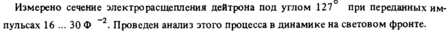 Измерено сечение электрорасщепления дейтрона под углом 127 при переданных импульсах 16 ... 30 Φ ~2. Проведен анализ этого процесса в динамике на световом фронте.