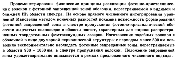 Продемонстрированы физические принципы реализации фотонно-кристалличес-ких волокон с фотонной запрещенной зоной оболочки, перестраиваемой в видимой и ближней ИК области спектра. На основе прямого численного интегрирования уравнений Максвелла методом конечных разностей показана возможность формирования фотонной запрещенной зоны в спектре пропускания фотонно-кристаллической оболочки дырчатых волноводов в области частот, характерных для широко распространенных твердотельных фемтосекундных лазеров. Изготовление подобных волокон с оболочкой в виде двумерной периодической структуры с периодом менее 500 нм позволило экспериментально наблюдать фотонные запрещенные зоны, перестраиваемые в области 930 1030 нм, в спектре пропускания волокон. Положение запрещенной зоны удовлетворительно описывается в рамках предложенного численного подхода.