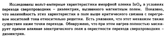 Исследованы вольт-амперные характеристики аморфной пленки 1пОх в условиях перехода сверхпроводник диэлектрик, вызванного магнитным полем. Показано, что нелинейность этих характеристик в поле выше критического связана с перегревом носителей тока относительно решетки. Есть указания, что этот механизм также существен ниже точки перехода. Обнаружено, что при этом нагрев полностью маскирует прямое влияние электрического поля в окрестности перехода сверхпроводник -диэлектрик.