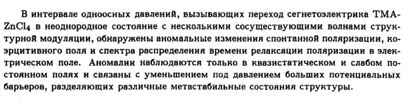В интервале одноосных давлений, вызывающих переход сегнетоэлектрика ТМА-ZnCLj в неоднородное состояние с несколькими сосуществующими волнами структурной модуляции, обнаружены аномальные изменения спонтанной поляризации, коэрцитивного поля и спектра распределения времени релаксации поляризации в электрическом поле. Аномалии наблюдаются только в квазистатическом и слабом постоянном полях и связаны с уменьшением под давлением больших потенциальных барьеров, разделяющих различные метастабильные состояния структуры.