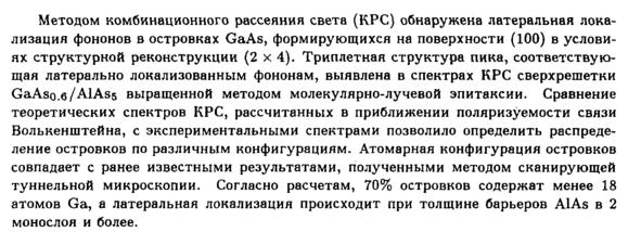 Методом комбинационного рассеяния света (КРС) обнаружена латеральная локализация фононов в островках GaAs, формирующихся на поверхности (100) в условиях структурной реконструкции (2 χ 4). Триплетная структура пика, соответствующая латерально локализованным фононам, выявлена в спектрах КРС сверхрешетки GaAso.e/AlAse выращенной методом молекулярно-лучевой эпитаксии. Сравнение теоретических спектров КРС, рассчитанных в приближении поляризуемости связи Волькенштейна, с экспериментальными спектрами позволило определить распределение островков по различным конфигурациям. Атомарная конфигурация островков совпадает с ранее известными результатами, полученными методом сканирующей туннельной микроскопии. Согласно расчетам, 70% островков содержат менее 18 атомов Ga, а латеральная локализация происходит при толщине барьеров AlAs в 2 монослоя и более.