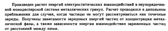 Произведен расчет энергий электростатических взаимодействий в неупорядоченной монодисперсной системе металлических гранул. Расчет проводился в дипольном приближении для случая, когда частицы не могут рассматриваться как точечные заряды. Получены зависимости зарядовых энергий частиц от концентрации металлической фазы, а также зависимости энергии взаимодействия заряженных частиц от расстояний между ними.