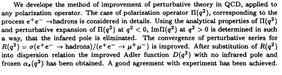 We develope the method of improvement of perturbative theory in QCD, applied to any polarization operator. The case of polarization operator H{q2)t corresponding to the process e+e- -^hadrons is considered in details. Using the analytical properties of Π(ς2) and perturbative expansion of П(д2) at q2 < 0, imll(q2) at q2 > 0 is determined in such a way, that the infared pole is eliminated. The convergence of perturbative series for R{q2) = σ(β+β~ hadrons)/(e+e~ -> μ+μ~) is improved. After substitution of R(q2) into dispersion relation the improved Adler function D(q2) with no infrared pole and frozen a3(q2) has been obtained. A good agreement with experiment has been achieved.