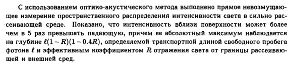 С использованием оптико-акустического метода выполнено прямое невозмущаю-щее измерение пространственного распределения интенсивности света в сильно рассеивающей среде. Показано, что интенсивность вблизи поверхности может более чем в 5 раз превышать падающую, причем ее абсолютный максимум наблюдается на глубине £(1 — Я)(1 — 0.4Я), определяемой транспортной длиной свободного пробега фотона I и эффективным коэффициентом R отражения света от границы рассеивающей и внешней сред.
