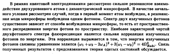 В рамках квантовой электродинамики рассмотрено сильное резонансное взаимодействие двухуровневого атома с диэлектрической микросферой. В качестве начального условия рассмотрен случай, когда в первый момент атом возбужден, а резонансная мода микросферы возбуждена одним фотоном. Спектр двух излученных фотонов существенно зависит от способа возбуждения микросферы, то есть от пространственного распределения энергии фотона по пространству. Наиболее характерной чертой двухфотонного спектра флюоресценции является сильная корреляция излученных фотонов по энергиям. Эта корреляция выражается в том, что энергии излученных фотонов связаны уравнением эллипса (ω\ +ωι 2шд)2 + 3(ωι — и>з)2 = 4Пдо4<. Связь полученных результатов с предсказаниями теории одетых состояний обсуждается.