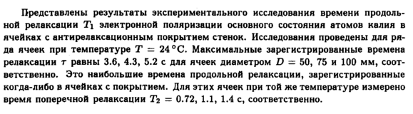 Представлены результаты экспериментального исследования времени продольной релаксации Τι электронной поляризации основного состояния атомов калия в ячейках с антирелаксационным покрытием стенок. Исследования проведены для ряда ячеек при температуре τ = 24 °С. Максимальные зарегистрированные времена релаксации г равны 3.6, 4.3, 5.2 с для ячеек диаметром d = 50, 75 и 100 мм, соответственно. Это наибольшие времена продольной релаксации, зарегистрированные когда-либо в ячейках с покрытием. Для этих ячеек при той же температуре измерено время поперечной релаксации Тг = 0.72, 1.1, 1.4 с, соответственно.