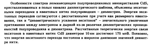 Особенности спектров люминесценции полупроводниковых нанокристаллов CdS, кристаллизованных в полых каналах диэлектрического шаблона, объяснены экситон-ными переходами в квантовых нитях полупроводник диэлектрик. Энергии экси-тонных переходов согласуются с рассчитанными при учете как размерного квантования, так и "диэлектрического усиления экситонов" значительного увеличения притяжения между электроном и дыркой из-за различия диэлектрических проница-емостей полупроводника и диэлектрика. Рассчитанные теоретически энергии связи экситонов в квантовых нитях CdS диаметром 10 им достигают 170 мэВ. Показано, что энергия экситонного перехода постоянна в широком диапазоне значений диаметра нити.