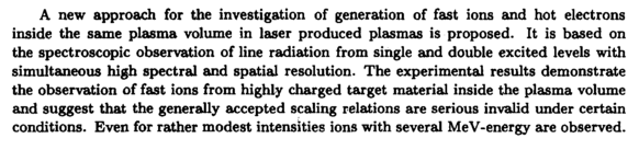 A new approach for the investigation of generation of fast ions and hot electrons inside the same plasma volume in laser produced plasmas is proposed. It is based on the spectroscopic observation of line radiation from single and double excited levels with simultaneous high spectral and spatial resolution. The experimental results demonstrate the observation of fast ions from highly charged target material inside the plasma volume and suggest that the generally accepted scaling relations are serious invalid under certain conditions. Even for rather modest intensities ions with several MeV-energy are observed.