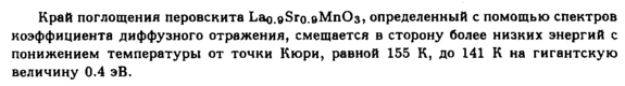 Край поглощения перовскита Ьао.дБго.эМпОз, определенный с помощью спектров коэффициента диффузного отражения, смещается в сторону более низких энергий с понижением температуры от точки Кюри, равной 155 К, до 141 К на гигантскую величину 0.4 эВ.
