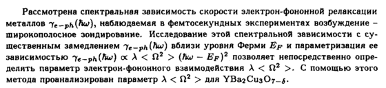 Рассмотрена спектральная зависимость скорости электрон-фононной релаксации металлов 7,._рь(Йи/), наблюдаемая в фемтосекундных экспериментах возбуждение -широкополосное зондирование. Исследование этой спектральной зависимости с существенным замедлением 7е_р/,(й<»>) вблизи уровня Ферми Ер и параметризация ее зависимостью 7е_р/,(йи>) ос λ < Ω2 > (Нш — Ер)2 позволяет непосредственно определять параметр электрон-фононного взаимодействия λ < Ω2 >. С помощью этого метода проанализирован параметр λ < Ω2 > для УВагСиз07_^.
