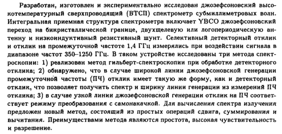 Разработан, изготовлен и экспериментально исследован джоэефсоновский высокотемпературный сверхпроводящий (ВТСП) спектрометр субмиллиметровых волн. Интегральная приемная структура спектрометра включает YBCO джоэефсоновский переход на бикристаллической границе, двухщелевую или логопериодическую антенну и низкоиндуктивный резистивный шунт. Селективный детекторный отклик и отклик на промежуточной частоте 1,4 ГГц измерялись при воздействии сигнала в диапазоне частот 350-1250 ГГц. В таком устройстве исследованы три метода спектроскопии: 1) реализован метод гильберт-спектроскопии при обработке детекторного отклика; 2) обнаружено, что в случае широкой линии джозефсоновской генерации промежуточной частоты (ПЧ) отклик имеет такую же форму, как и детекторный отклик, что позволяет получить спектр и ширину линии генерации из измерений ПЧ отклика; 3) в случае узкой линии джозефсоновской генерации отклик на ПЧ соответ~ ствует режиму преобразования с самонакачкой. Для вычисления спектра излучения предложен новый метод, состоящий из простых операций сдвига, суммирования и вычитания. Преимуществами метода являются простота, высокая чувствительность и разрешение.