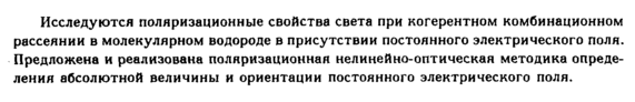 Исследуются поляризационные свойства света при когерентном комбинационном рассеянии в молекулярном водороде в присутствии постоянного электрического поля. Предложена и реализована поляризационная нелинейно-оптическая методика определения абсолютной величины и ориентации постоянного электрического поля.