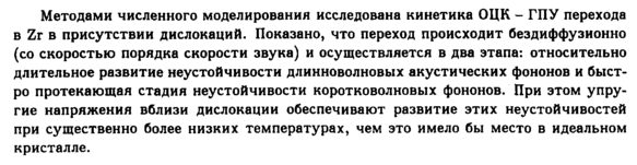 Методами численного моделирования исследована кинетика ОЦК ГПУ перехода в Zr в присутствии дислокаций. Показано, что переход происходит бездиффузионно (со скоростью порядка скорости звука) и осуществляется в два этапа: относительно длительное развитие неустойчивости длинноволновых акустических фононов и быстро протекающая стадия неустойчивости коротковолновых фононов. При этом упругие напряжения вблизи дислокации обеспечивают развитие этих неустойчивостей при существенно более низких температурах, чем это имело бы место в идеальном кристалле.