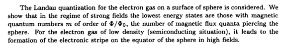 The Landau quantization for the electron gas on a surface of sphere is considered. We show that in the regime of strong fields the lowest energy states are those with magnetic quantum numbers m of order of Ф/Фо, the number of magnetic flux quanta piercing the sphere. For the electron gas of low density (semiconducting situation), it leads to the formation of the electronic stripe on the equator of the sphere in high fields.