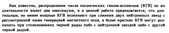 Как известно, распределение числа космических гамма-всплесков (КГБ) по их длительности имеет два максимума, и в данной работе предполагается, что длительные, но менее мощные КГБ возникают при слиянии двух нейтронных звезд с рассмотренной ниже генерацией магнитного поля, а более краткие КГБ могут возникать при столкновениях черной дыры либо с нейтронной звездой либо с другой черной дырой.