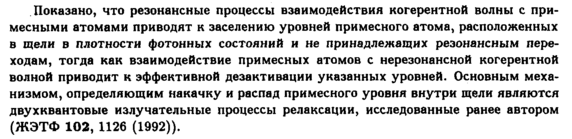Показано, что резонансные процессы взаимодействия когерентной волны с примесными атомами приводят к заселению уровней примесного атома, расположенных в щели в плотности фотонных состояний и не принадлежащих резонансным переходам, тогда как взаимодействие примесных атомов с нерезонансной когерентной волной приводит к эффективной дезактивации указанных уровней. Основным механизмом, определяющим накачку и распад примесного уровня внутри щели являются двухквантовые излучательные процессы релаксации, исследованные ранее автором (ЖЭТФ 102, 1126 (1992)).