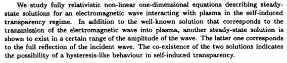 We study fully relativistic non-linear one-dimensional equations describing steady-state solutions for an electromagnetic wave interacting with plasma in the self-induced transparency regime. In addition to the well-known solution that corresponds to the transmission of the electromagnetic wave into plasma, another steady-state solution is shown to exist in a certain range of the amplitude of the wave. The latter one corresponds to the full reflection of the incident wave. The co-existence of the two solutions indicates the possibility of a hysteresis-like behaviour in self-induced transparency.