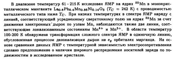 В диапазоне температур 61-215 К исследован ЯМР на ядрах 85Μη в монокристаллическом манганите Lao.ePbo.4Mno.8eNio.14O3 {Тс = 242 К) с проводимостью металлического типа ниже ТсПри низких температурах в спектре ЯМР наряду с линией, соответствующей усредненному сверхтонкому полю на ядрах 55Мп за счет движения электронных'дырок по узлам Μη, наблюдаются также две линии, соответствующие локализованным состояниям Мп4+ и Мп3+. В области температур 100-200 К обнаружена трансформация сложного спектра ЯМР в одиночную линию, обусловленная процессом делокализации дырок на ед орбиталях марганца. На основе сравнения данных ЯМР с температурной зависимостью электросопротивления сделано предположение о наличии широкого распределения носителей заряда по по-движностям в исследованном кристалле.