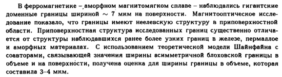 В ферромагнетике -^аморфном магнитомягком сплаве наблюдались гигантские доменные границы шириной ~ 7 мкм на поверхности. Магнитооптическое исследование показало, что границы имеют неелевскую структуру в приповерхностной области. Приповерхностная структура исследованных границ существенно отличается от структуры наблюдавшихся ранее более узких границ в железе, пермаллое и аморфных материалах. С использованием теоретической модели Шайнфайна с соавторами, связывающей значения ширины асимметричной блоховской границы в объеме и на поверхности, получена оценка для ширины границы в объеме, которая составила 3-4 мкм.