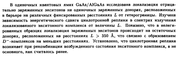 В одиночных квантовых ямах GaAs/AlGaAs исследована локализация отрицательно заряженных экситонов на одиночных заряженных донорах, расположенных в барьере на различных фиксированных расстояниях L от гетерограницы. Изучена зависимость энергетического сдвига циклотронной реплики в спектрах излучения локализованного экситонного комплекса от величины L. Показано, что в нелегированных образцах локализация заряженных экситонов происходит на остаточных донорах, расположенных на расстояниях L > 350 А, что связано с образованием £>~-комплексов на меньших расстояниях. Установлено, что циклотронная реплика возникает при рекомбинации возбужденного состояния экситонного комплекса, а не основного, как считалось ранее.