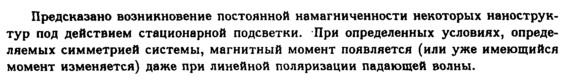 Предсказано возникновение постоянной намагниченности некоторых наноструктур под действием стационарной подсветки. При определенных условиях, определяемых симметрией системы, магнитный момент появляется (или уже имеющийся момент изменяется) даже при линейной поляризации падающей волны.