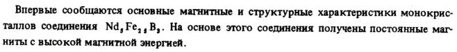Впервые сообщаются основные магнитные и структурные характеристики монокристаллов соединения Nd5 Fe2, В3. На основе этого соединения получены постоянные магниты с высокой магнитной энергией.