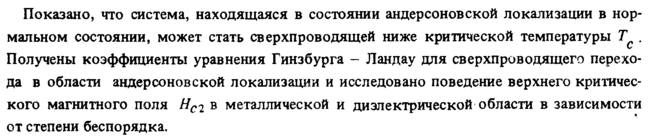 Показано, что система, находящаяся в состоянии андерсоновской локализации в нормальном состоянии, может стать сверхпроводящей ниже критической температуры Г,. Получены коэффициенты уравнения Гинзбурга Ландау для сверхпроводящего перехода в области андерсоновской локализации и исследовано поведение верхнего критического магнитного поля Нс2 в металлической и диэлектрической области в зависимости от степени беспорядка.