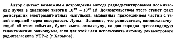 Автор считает возможным возрождение метода радиодетектирования космических лучей в диапазоне энергий 1022 — 1023 эВ. Доказательством этого станет факт регистрации электромагнитных импульсов, вызванных прохождением частиц с такой энергией через поверхность Луны. Показано, что радиосигнал, свидетельствующий об этом событии, будет иметь амплитуду, на два порядка превосходящую галактические радиошумы, если для этой цели использовать антенну декаметрового радиотелескопа УТР-2 (г.Харьков).