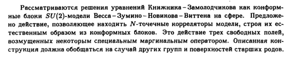 Рассматриваются решения уравнений Книжника Замолодчикова как конформные блоки 5С/(2)-модели Весса Зумино Новикова Виттена на сфере. Предложено действие, позволяющее находить N-точечные корреляторы модели, строя их естественным образом из конформных блоков. Это действие трех свободных полей, возмущенных некоторым специальным маргинальным оператором. Описанная конструкция должна обобщаться на случай других групп и поверхностей старших родов.