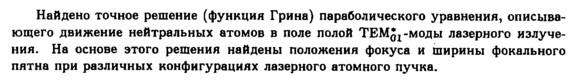Найдено точное решение (функция Грина) параболического уравнения, описывающего движение нейтральных атомов в поле полой TEMgj-моды лазерного излучения. На основе этого решения найдены положения фокуса и ширины фокального пятна при различных конфигурациях лазерного атомного пучка.