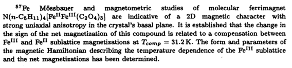 s7Fe Mossbauer and magnetometric studies of molecular ferrimagnet N(n-CBHii)4[FenFein(C204)3] are indicative of a 2D magnetic character with strong uniaxial anisotropy in the crystal's basal plane. It is established that the change in the sign of the net magnetization of this compound is related to a compensation between Fem and Fe11 sublattice magnetizations at TCOmp = 31.2 K. The form and parameters of the magnetic Hamiltonian describing the temperature dependence of the Fe111 sublattice and the net magnetizations has been determined.