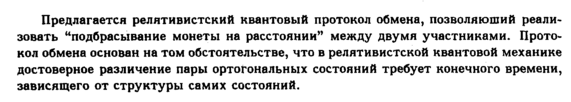 Предлагается релятивистский квантовый протокол обмена, позволяющий реализовать "подбрасывание монеты на расстоянии" между двумя участниками. Протокол обмена основан на том обстоятельстве, что в релятивистской квантовой механике достоверное различение пары ортогональных состояний требует конечного времени, зависящего от структуры самих состояний.