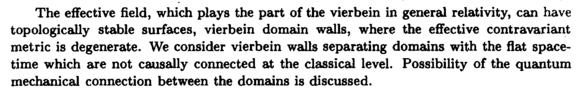 The effective field, which plays the part of the vierbein in general relativity, can have topologicaily stable surfaces, vierbein domain walls, where the effective contravariant metric is degenerate. We consider vierbein walls separating domains with the flat space-time which are not causally connected at the classical level. Possibility of the quantum mechanical connection between the domains is discussed.