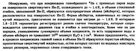Обнаружено, что при конденсации газообразного 4 Не с примесью паров воды на поверхности сверхтекучего Не-Н, охлажденного до ~ 1.4 К, в объеме стеклянной ячейки, заполненной Не-Н, образуются полупрозрачные облака (айсберги), которые располагаются под поверхностью Не-П. Форма айсбергов, извлеченных из сверхтекучей жидкости, практически не изменяется при нагреве до ~ 1.8 К. В интервале 1.8-2.2 К термометры регистрируют резкие скачки температуры, которые сопровождаются скачками давления газа в ячейке и многократным, более чем на два порядка, уменьшением суммарного объема конденсата, то есть содержание воды в объеме айсберга не превышает 1020 молекул НгО в 1см3. Можно предположить, что в процессе конденсации газовой смеси в объеме Не-П образуются пористые айсберги, пропитанные сверхтекучей жидкостью, остов которых состоит из водяных кластеров малых размеров, окруженных слоем отвердевшего гелия.
