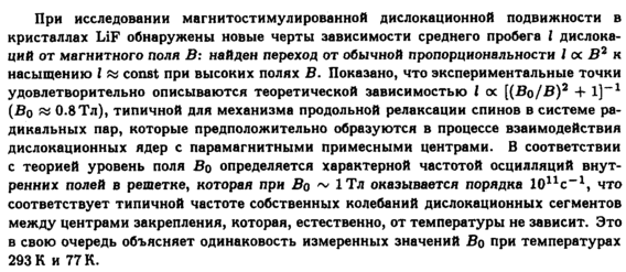 ![<b>При исследовании магнитостимулированной дислокационной подвижности в кристаллах LiF обнаружены новые черты зависимости среднего пробега I дислокаций от магнитного поля В: найден переход от обычной пропорциональности <i>I </i>ос В<sup>2</sup> к насыщению 2 « const при высоких полях <i>В. </i>Показано, что экспериментальные точки удовлетворительно описываются теоретической зависимостью / ос [(Во/В)<sup>2</sup> + I]<sup>-1 </sup>(Во </b>рз <b>0.8Тл), типичной для механизма продольной релаксации спинов в системе радикальных пар, которые предположительно образуются в процессе взаимодействия дислокационных ядер с парамагнитными примесными центрами. В соответствии с теорией уровень поля Во определяется характерной частотой осцилляций внутренних полей в решетке, которая при Во ~ 1Тл оказывается порядка 10<sup>и</sup>с<sup>-1</sup>, что соответствует типичной частоте собственных колебаний дислокационных сегментов между центрами закрепления, которая, естественно, от температуры не зависит. Это в свою очередь объясняет одинаковость измеренных значений Во при температурах 293 К и 77 К.</b>](/ps/921/article_14089_800_head.png)