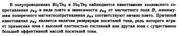 В полупроводниках ЕИгТез и БЬгТез наблюдается квантование холловского сопротивления рШу в виде плато в зависимости рху от магнитного поля В, минимумам поперечного магнитосопротивления рхх соответствуют начало плато. Причиной квантования рху является наличие резервуара носителей тока, роль которого играет примесная зона с высокой плотностью состояний или другая зона с существенно большей эффективной массой носителей тока.