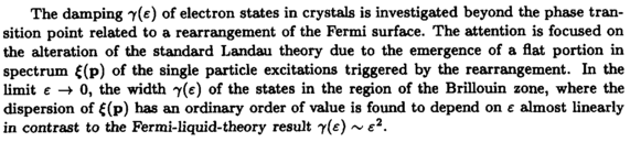 The damping 7(e) of electron states in crystals is investigated beyond the phase transition point related to a rearrangement of the Fermi surface. The attention is focused on the alteration of the standard Landau theory due to the emergence of a flat portion in spectrum ξ(ρ) of the single particle excitations triggered by the rearrangement. In the limit e -> 0, the width 7(e) of the states in the region of the Brillouin zone, where the dispersion of ξ(ρ) has an ordinary order of value is found to depend on ε almost linearly in contrast to the Fermi-liquid-theory result у (ε) ~ ε2.