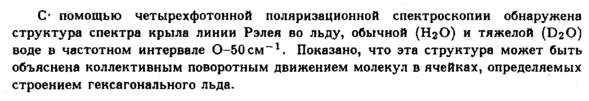 Спомощью четырехфотонной поляризационной спектроскопии обнаружена структура спектра крыла линии Рэлея во льду, обычной (НгО) и тяжелой (D2O) воде в частотном интервале О-50см-1. Показано, что эта структура может быть объяснена коллективным поворотным движением молекул в ячейках, определяемых строением гексагонального льда.