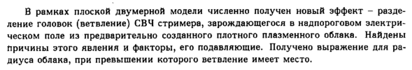В рамках плоской двумерной модели численно получен новый эффект разделение головок (ветвление) СВЧ стримера, зарождающегося в надпороговом электрическом поле из предварительно созданного плотного плазменного облака. Найдены причины этого явления и факторы, его подавляющие. Получено выражение для радиуса облака, при превышении которого ветвление имеет место.