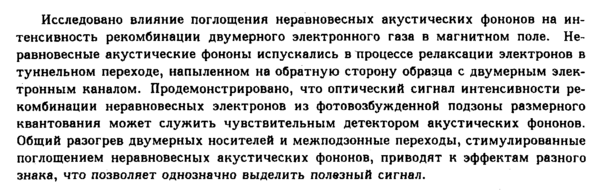 Исследовано влияние поглощения неравновесных акустических фононов на интенсивность рекомбинации двумерного электронного газа в магнитном поле. Неравновесные акустические фононы испускались в процессе релаксации электронов в туннельном переходе, напыленном на обратную сторону образца с двумерным электронным каналом. Продемонстрировано, что оптический сигнал интенсивности рекомбинации неравновесных электронов из фотовозбужденной подзоны размерного квантования может служить чувствительным детектором акустических фононов. Общий разогрев двумерных носителей и межподзонные переходы, стимулированные поглощением неравновесных акустических фононов, приводят к эффектам разного знака, что позволяет однозначно выделить полезный сигнал.
