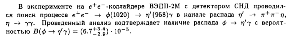 В эксперименте на е+е~-коллайдере ВЭПП-2М с детектором СНД проводился поиск процесса е+е~ -> 0(1020) η' (958)7 в канале распада η' —» π+π~τ?, η —> 77. Проведенный анализ подтверждает наличие распада 0 -» η'7 с вероятностью Б(0 -> 7/7) = (e.7iJ;J) · ΙΟ"5.