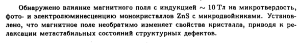 Обнаружено влияние магнитного поля с индукцией ~ 10 Тл на микротвердость, фотои электролюминесценцию монокристаллов ZnS с микродвойниками. Установлено, что магнитное поле необратимо изменяет свойства кристалла, приводя к релаксации метастабильных состояний структурных дефектов.